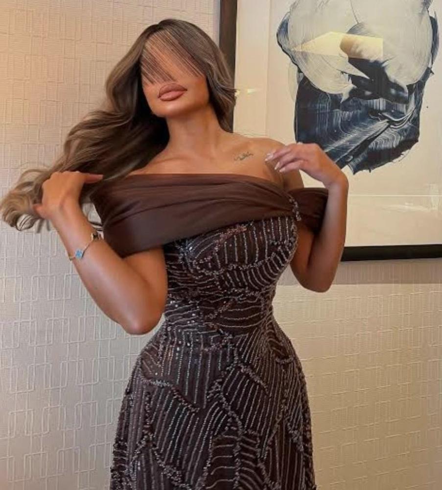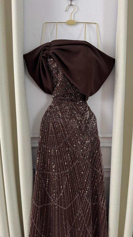 - فستان بني أنيق بتصميم سهرة راقي ✨