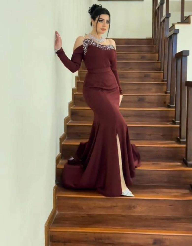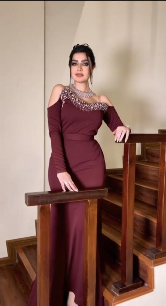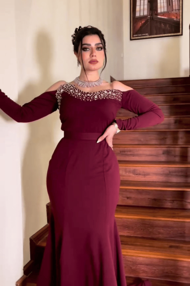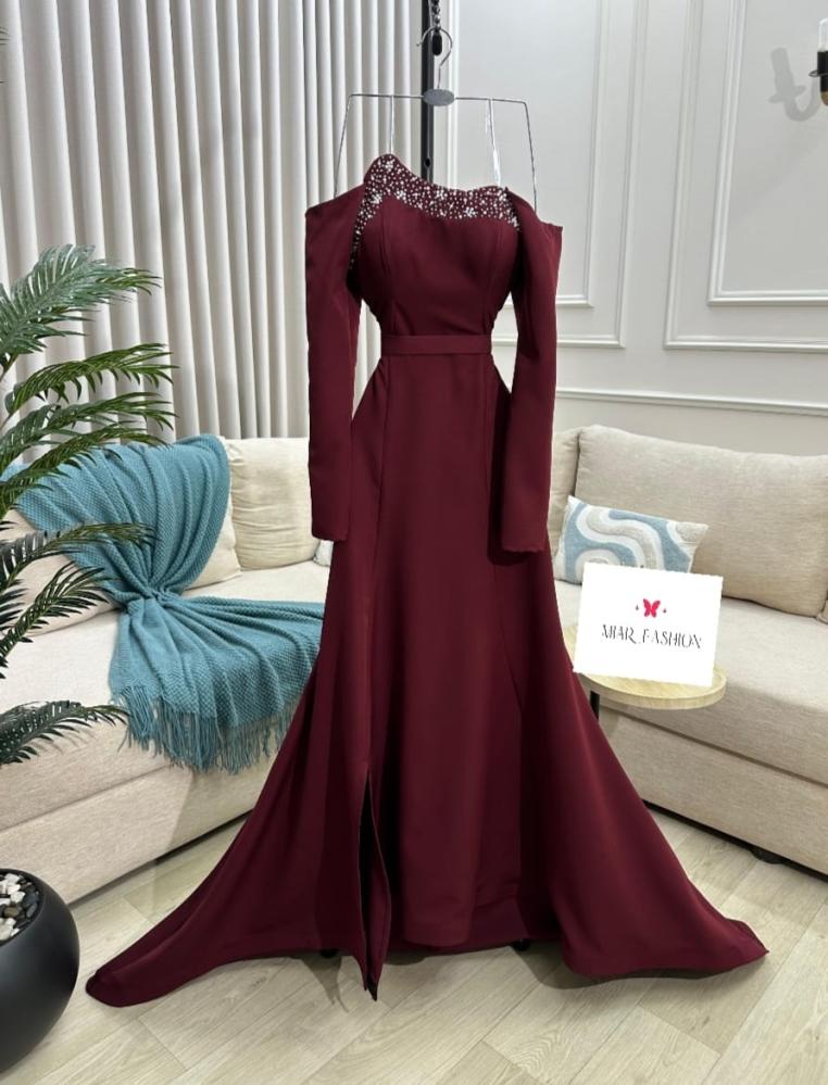 - أكمام طويلة أنيقة تمنح الفستان طابعًا كلاسيكيًا فخمًا.