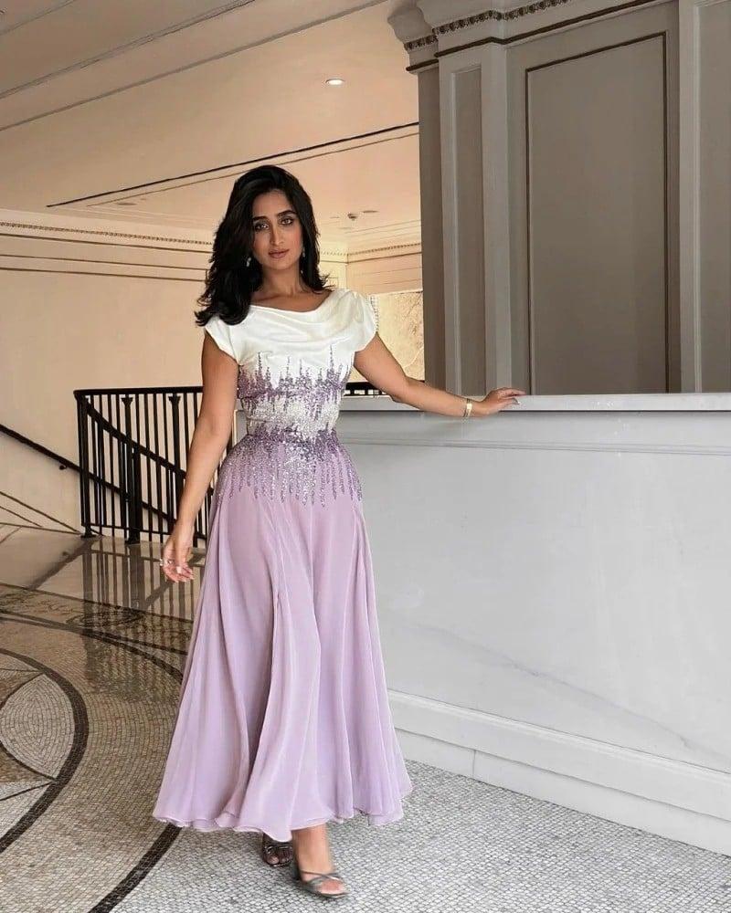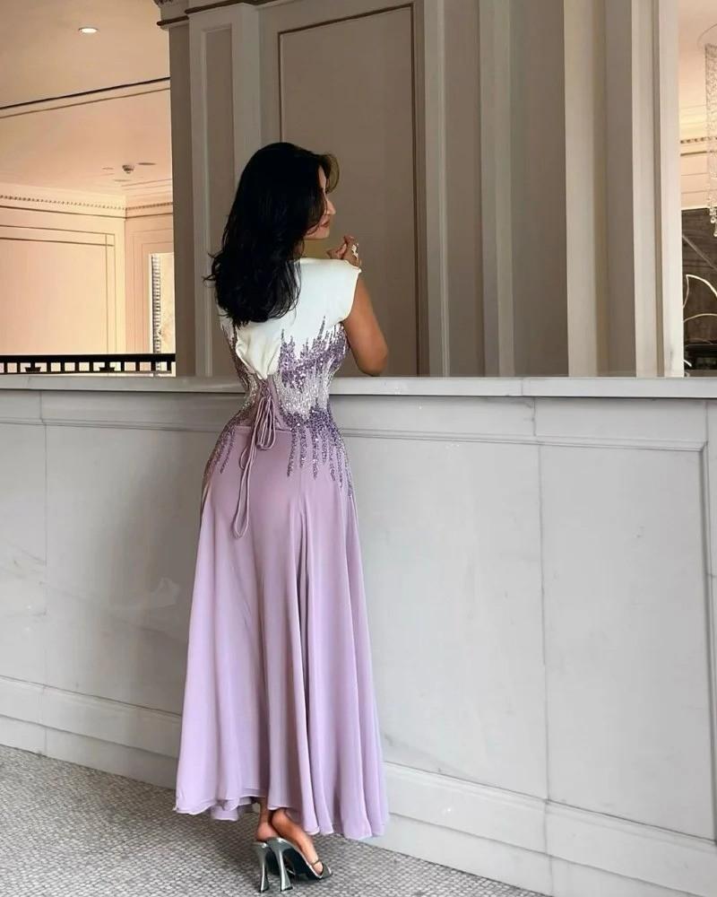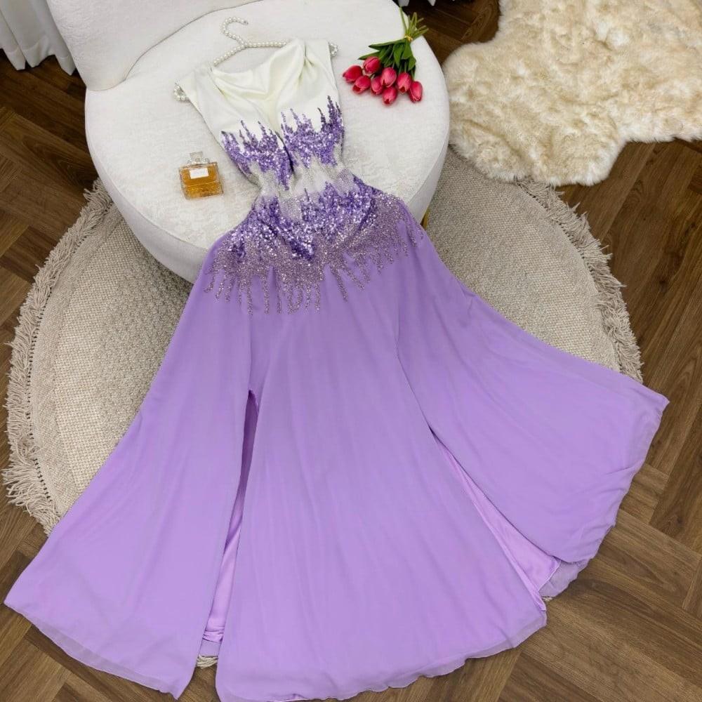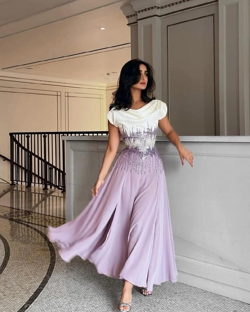 الوصف/ فستان سهره راقي يأتيكي باللون الابيض مع الموف ليعطيكي منظرا جميلا